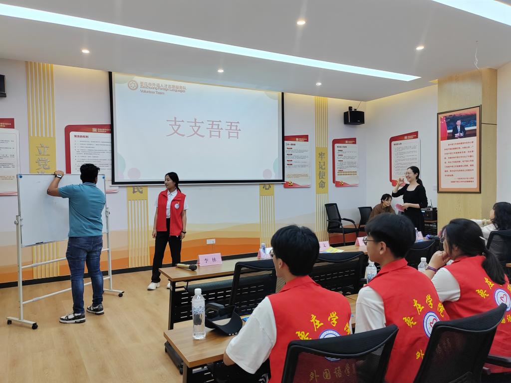 活动前期,学院精心选拔优秀学生,并围绕传统文化、城市特色、政策方针、优势产业、古语典故等内容进行了大量准备工作。活动期间,在“你说我猜”和“你写我猜”互动环节中,外院学子与外国留学生们通力合作完成竞技比拼,在轻松愉悦的氛围中既加深了对中华文化和市情市况的宣传,又提升了口语交流能力,将外语学习与实战演练完美融合。随后,大家还集中参观了金远社区居民活动中心和社区公共服务中心,深入了解了社区务实高效的管理模式以及各项便民工作的开展情况。